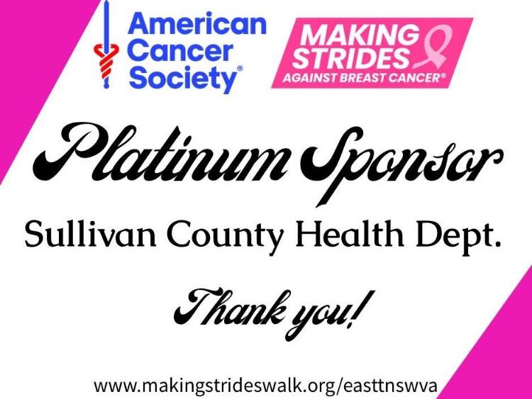 Sullivan County Regional Health Department is proud to be a Platinum Sponsor of the upcoming Stand Up To Cancer 5K taking place in Bristol, Virginia. This event will take place on October 18th, at 10am. This impactful event brings our community together to raise awareness and critical funds for cancer research through the American Cancer Society. As a public health organization, we are deeply committed to supporting efforts that promote prevention, early detection, and treatment of cancer. By sponsoring this event, we stand in solidarity with those affected by cancer and are honored to help advance the mission of finding a cure.
