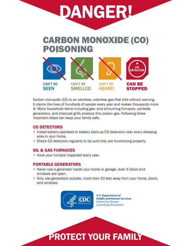 Carbon monoxide (CO) is an odorless, colorless gas that kills without warning. It claims the lives of hundreds of people every year and makes thousands more ill. Many household items including gas- and oil-burning furnaces, portable generators, and charcoal grills produce this poison gas. Following these important steps can keep your family safe.